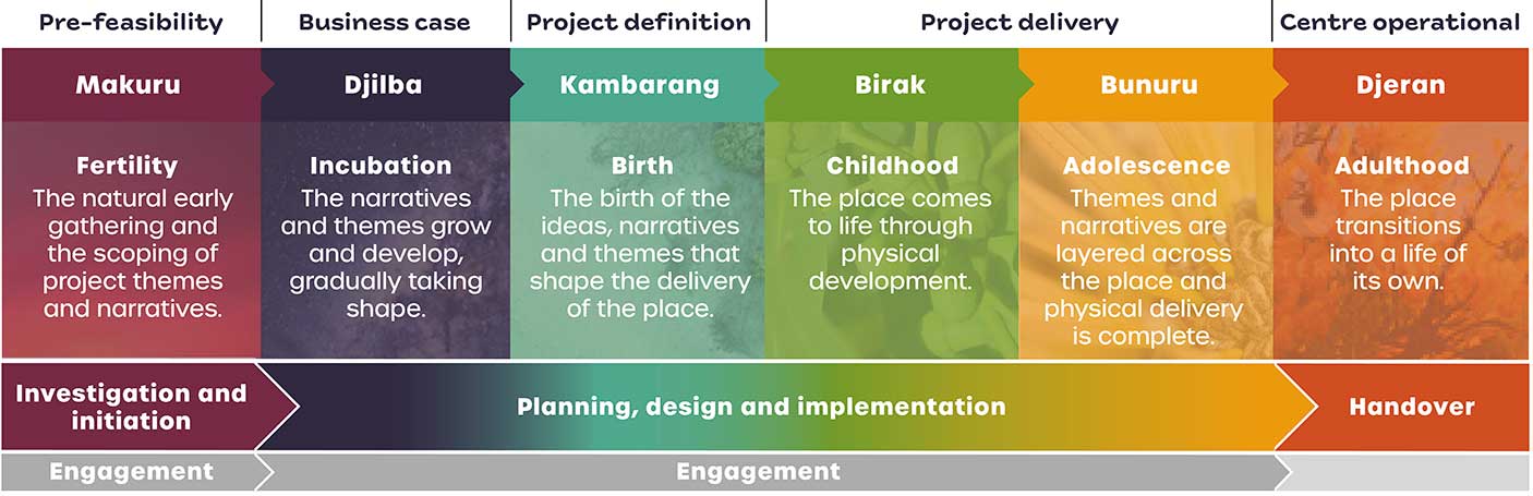 The 6 seasons framework outlines each phase of the project’s development which is connected to Noongar boodja (Country) seasons and life cycle.