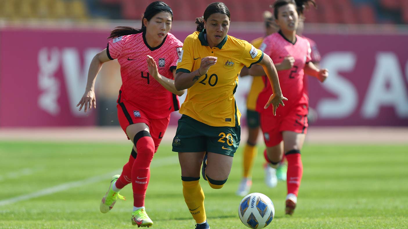 Photo: Sam Kerr of Australia controls the ball under pressure. Image Getty Images/Thananuwat Srirasant/Stringer.