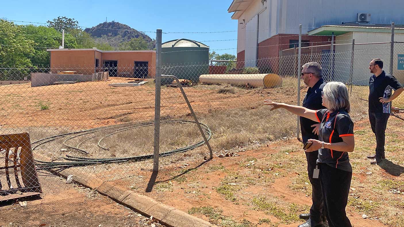 Photo: Shire of Wyndham East Kimberley — Manager of Community Development Marlene Renton showing Troy and Jaygan a proposed site for the Kununurra Leisure Centre expansion — a key priority for the local government.