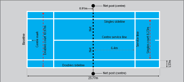 The court is 23.77m long and for singles matches, 8.23m wide. For doubles matches the court is 10.97m wide.